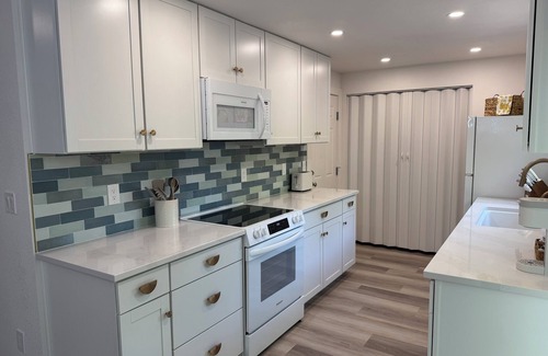 Prepare snacks or meals in the fully-stocked kitchen that opens to the dining area; enjoy the company of your guests in this open-concept space. The kitchen features quartz counters and beautiful gold hardware. A Keurig coffee maker and pods are provided, as well as tea and basic seasonings and baking ingredients. Enjoy the filtered RO system water for drinking as well!