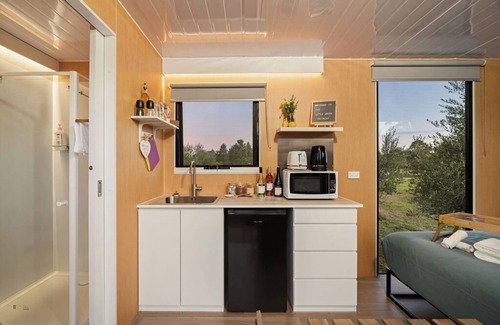 A cozy 139-square-foot tiny home in the Riverina, featuring charming holiday homes with easy access to water, split air conditioning, a kitchenette, cooking equipment, and excellent bathroom facilities. These amenities include an eco-friendly cassette toilet with a removable waste holding tank, hand basin, and shower (gas-heated for hot showers).