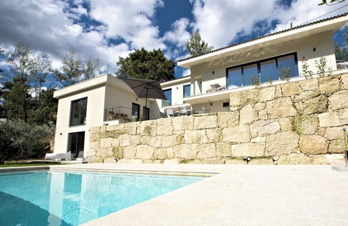 The 2 houses are rented as one property. The property features a private pool, a rooftop terrace, a private vineyard, and a private forest. You can enjoy 360 degrees of privacy with fantastic views all around.