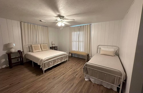 Nestled on 2 acres, the 1,700 sf farmhouse is equipped with a full kitchen, fridge, dishwasher, toaster, microwave and a Smart TV. A Keurig is provided along with coffee. There are two full bathrooms as well as a washer and dryer onsite, and yes there is central air & heat! Guests will have access to the entire house and large shaded yard. You will find a BBQ grill and utensils under the carport. There is ample parking on the property, even if you bring a boat. Wifi is available.