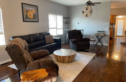 Unwind in Great Bend at this superb house. With 3 cozy bedrooms including a queen bed, 2 twin beds, and a full bed and twin bed in the downstairs bedroom guests will feel right at home. Enjoy the convenience of amenities like WiFi, a washing machine and dryer, and AC. The bathroom features a relaxing bathtub and a hair dryer for added comfort. The house has a relaxing deck on the back porch with a grill. Your furry friends will love the fenced back yard. We think our place will help you experience everything Great Bend has to offer.