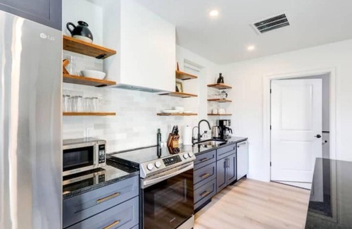 "The Loft at Legacy Manor" is a distinctive 1-bedroom, 1-bath Airbnb, featuring a loft-style bedroom on the second floor and a wheelchair-accessible bathroom and kitchen on the first floor.. The cozy living space is complemented by a private courtyard with a fire pit, charcoal grill, and dining table, making it an ideal choice for couples or solo travelers seeking a stylish and accommodating retreat that caters to a variety of guest needs. The shared yard on the other side of the parking lot fence has a putting green, fire pit area, gazebo, and a kids play set.