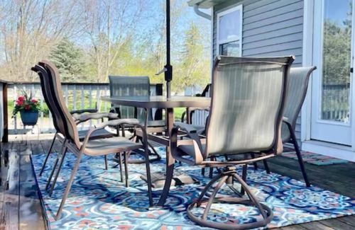 The large yard is perfect for family fun! Cozy up to the fire pit and roast some marshmallows supplied with benches, camp chairs and roasting sticks. Then gather your group for dinner on the deck at the patio table that sits 6.