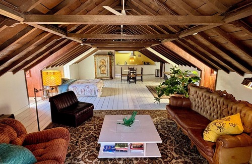 The Loft is about 75m2 with its own entrance at the side of the house where we live downstairs with our parrot and two rescue dogs.