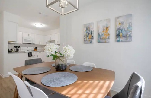 A comfortable space with a sofa and loveseat, where everyone can gather to kick back and relax, watch the 55-in smart TV, or play one of the board games provided by us! The sliding glass door off the living room leads to the screened in patio and backyard. Your group will be able to sit down and enjoy meals together at the 6 person dining table, or choose to head outside for cocktail hour.