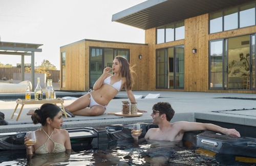 Situated at the edge of Joshua Tree in one of the most exclusive neighborhoods overlooking the National Park, this modern, luxury, Scandinavia-inspired oasis features a large seasonal swimming pool. Adorned in exotic wood and floor-to-ceiling sliders, this compound property on one private acre is an indoor/outdoor living experience of the highest order. Unwind from a day of hiking under starry skies in our sunken jacuzzi. Sunbathe in our spacious outdoor area featuring daybeds and a Baja tanning shelf.