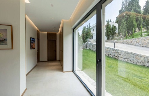 This brand-new luxury lake-view villa boasts 4 bedrooms, 4 bathrooms, modern amenities, a luxury pool, and captivating art in every room. Guests can relax by the pool, taking in the breathtaking views of the lake and Alps. The villa features a fully equipped kitchen and a stylish dining area offering panoramic views. On the patio of the villa, the pool seamlessly blends with the sky and landscape. This villa is the perfect place for an escape where art, nature, and luxury intertwine.