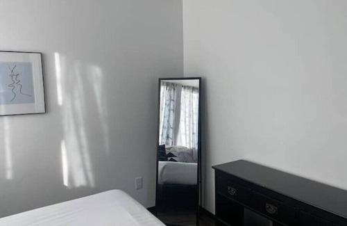 The Modern (upstairs 2nd floor apartment) has its own entrance that is separate from the owners living quarters downstairs. Guest living room has a view of one of the last in-city horse ranches remaining. So be sure to say hi to the horses, Brando and Chance. Each bedroom is equipped with a queen bed. Living room has a couch, chair and big screen TV with streaming services and wifi. Kitchenette has dining area (which also makes a great work space), Microwave, mini fridge, Coffee maker, plates, bowls, cups, mugs, wine glasses. Salt and pepper, sugar, creamer, coffee and tea. Bathroom has tub/shower combo and starter set bath products.
