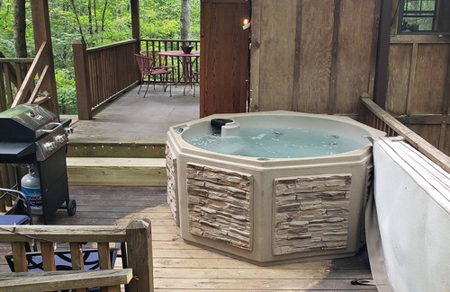 This 512 sq. ft. cabin, with additional loft space is nestled in the heart of the Cherokee National Forest. This cabin is very private and sleeps up to 6 people. Sitting on the porch, you have tree house views of the surrounding woods. It is close to the Hiwassee river which has rafting and tubing as well as fishing. National Forest hiking trails are right across the road from the main entrance and horse friendly. A small corral for all the cabins is also available for up to six horses.