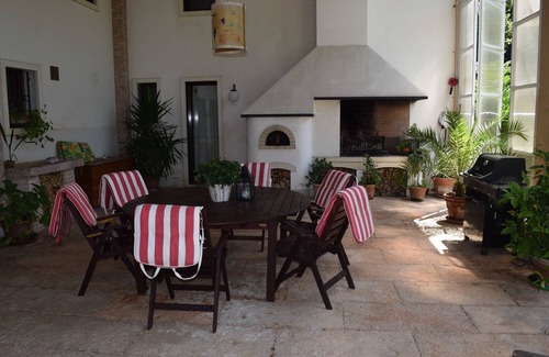 Three bedroom and two bathroom apartment in a restored farmhouse. On two floors with beamed ceilings. The main bedroom has a 4 metre arched window overlooking the garden & farmland. Upstairs has wooden & marble floors. Downstairs has terracotta tiles and an 18th Century (working) stone fireplace, very well furnished with classical Italian walnut furniture. Independent entrances. Outside fireplace, pizza oven. 3-acre garden with mature trees. Courtyard parking & barn space for 2 cars. 200m tree-lined driveway & electric gate. Very quiet & private location on 400-acre organic arable farm. Near (1km) to the village with shops and restaurant. Beautiful views of Berici & Euganei hills. Use of Swimming pool, Jacuzzi, Sauna, and Gym 5 minutes drive or bicycle ride from the house and on the farm property as part of the Palazzo Rosso Farm facilities. Please make note, there is no pool on this property, some aerial pictures of the property include a picture of an above-ground pool, this is no longer in use.