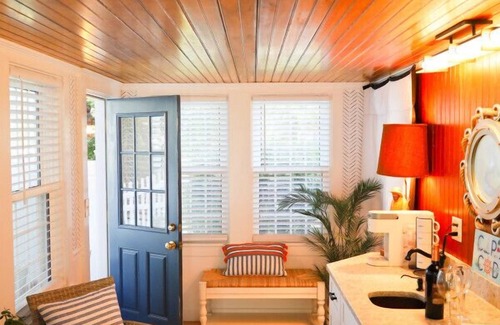 Enjoy this classic cape cod oasis directly across the street from Allen Harbor. This space has a private deck with a table for 2, where you can sit, relax and enjoy the fresh air off the comfort of your room. This space has a King size bed, flat screen tv and a mini split unit for A.C and heat. There is a sliding barn door off of the bedroom leading you into a cozy sitting area with a mini kitchenette (fridge & speed microwave oven) and a table for 2. Lastly, the bathroom has a huge walk in shower equipped with two shower heads and a rain head.