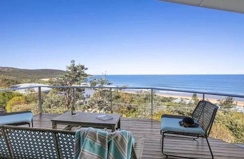 This architecturally designed beach house captures the stunning ocean views from Killcare to Putty Beach over three levels and offers the ultimate in contemporary, beach-side living. The top floor has the convenience of a powder room, the fully equipped recently refurbished kitchen with gas cooking and two fridges, a reading lounge with work station and of course the spectacular dining area with seating for 12. Both lounge areas open up to outdoor entertaining areas that capture both the beach and bush vistas. The BBQ and outdoor setting is perfect for balmy summer evenings.
