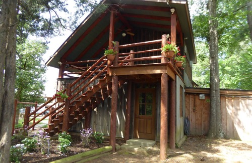The Nest is quietly nestled among the trees at the estate where you can sit on the front porch area and enjoy quiet times watching the neighboring cattle stroll by, the birds hopping from branch to branch or the breezes creating ripples on the lake surface. The air-conditioned garage studio is accessed by a rustic log staircase and leads to a relaxing 210 sf outside sitting area on cast aluminum cushioned sofa and chair and also features a bistro dining table, ceiling fan and a Weber grill. Once you enter the 400 sf space, you'll enjoy a panoramic view of the adjacent cattle ranch. The architectural timber-frame supports along with the interesting dormer windows and 18" wide plank floors will make you think you're staying in a European country estate. You'll sleep soundly under ceiling fans in the aged cedar wood queen bed with pine themed quilt and find a dining area, living area with sofa and recliner, satellite TV service, dresser, granite counter-top kitchenette with convection microwave, all pots and pans and dishes as well as silverware for your convenience. The bathroom has a quaint corner sink and cabinet and you'll love the tumbled granite shower. All the windows have shades for privacy and the night sensing lights as well as the motion sensor security lights will make you feel safe when accessing The Nest by the stone steps and cobblestone walkway at night.