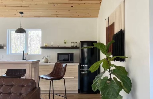 Discover the Nordic Nest, a Scandinavian-inspired retreat offering tranquility and luxury. This cozy space offers open-concept living, a full kitchen, and a serene bedroom. Enjoy the spa-like bathroom and unwind on the beautiful covered outdoor patio surrounded by stunning wooded views. Perfect for relaxation, the Nordic Nest is a rejuvenating escape. The Nordic-inspired home is located 1/2 mile to the Red Cedar Trail and the quaint small town of Downsville, yet 6 miles south of Menomonie & UW-Stout. Featured on the YouTube channel "HomewithStefani"