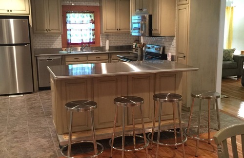The kitchen is fully stocked with dishes, cookware, silverware, glasses, dish towels, trash bags, and basics for cooking (salt, pepper, garlic salt, etc). Refinished original hardwood floors and new tile throughout the home. Every guest that has rented this house has been 100% satisfied. They loved it, and you will too!