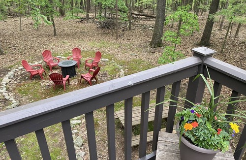 Located at the end of a quiet cul-de-sac on a flat lot with plenty of parking. Enjoy looking through the expansive floor-to-ceiling windows into the beautiful surrounding woods and watch the deer and birds in their natural habitat. Two propane fire pit tables, one located on the large deck and one in the back yard surrounded by woods where you can gather with friends and family to make s'mores and swap stories of your day. Fully stocked kitchen and outdoor gas grill so you can eat every meal at home, or order delivery or takeout from many nearby great restaurants and eateries.
