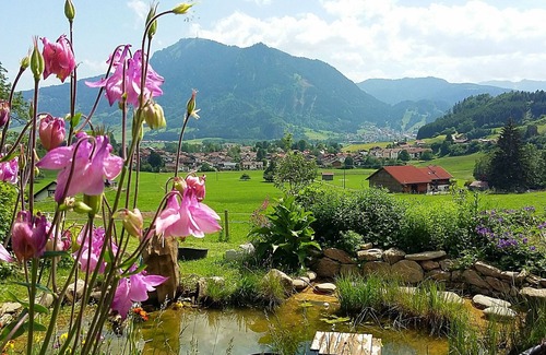Gentle hills, colorful mixed forests, lush mountain meadows, and the Allgäu Braunvieh from Opa's farm are as much a part of our landscape as the striking peaks of the high mountains. Fairytale sunrises and the "alpenglow" can be enjoyed from your terrace. Pure relaxation promises also the large sunbathing area above the house, which is lined with beautiful flowering fruit trees in spring. And when the wind gently brushes through the leaves of the old trees, the fire crackles on the barbecue and the hawk makes its rounds, the "holiday feeling" comes naturally. And it's getting cold outside, then cuddle up in front of the warm stove in the living room. Safe and comfortable in this old wooden house with its creaking beams and relatively low ceilings. But that's what makes the unique "feel-good charm" of our Allgäu wooden house. A bit of mountain romance paired with modern facilities, that's the "Blumenoase Allgäu"!