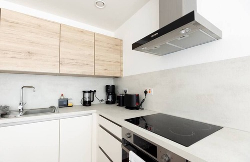 Beautifully equipped kitchen with fridge, freezer, electric oven, electric hob, kettle & coffee machine.