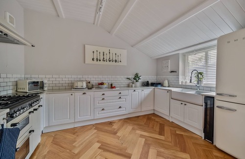 On arrival at The Orangery, you enter through a small porch and in to a pretty hallway, off which you will find the impressive day space which includes an open-plan sitting area with feature wood burning stove, a dining area with french doors, and the well-equipped kitchen. This bright space has been cleverly designed so that families and couples can enjoy relaxing and eating together, with plenty of room for all, and the kitchen with its generous range cooker and Smeg appliances provides everything you could need for preparing delicious meals and snacks.