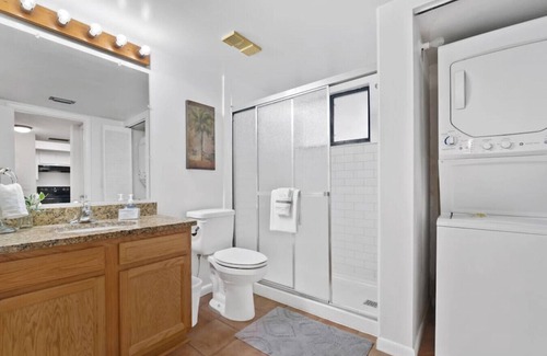 Full bathroom has an entry from the hall or bedroom. Shower is a walk in with brand new tile, washer and dryer in the unit as well. Unit has all you need including an ironing board, iron, and beach chairs.