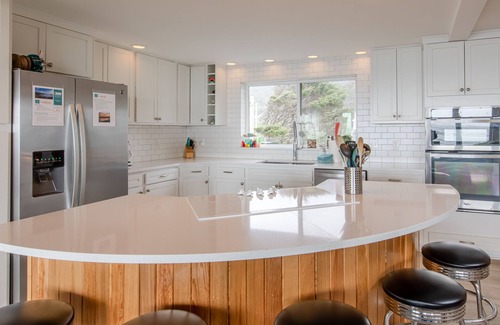 An open concept living area with a wall of windows opens the home to unobstructed, panoramic views of Castle Rock, the beach and amazing sunsets. Take it all in from an expansive deck featuring a hot tub. A warm and well-appointed home, you're free to enjoy your large or intimate gatherings at the beach, while being within easy distance to nearby quaint towns, attractions, hikes and more beaches to explore.