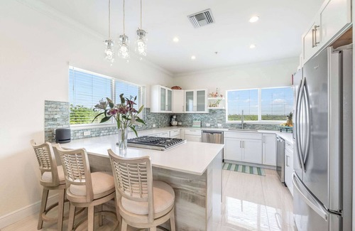 - Large fully equipped kitchen with modern appliances, dishwasher, quartz countertops, breakfast bar, wine fridge, Nespresso coffee maker w/coffee, cream and sugar and propane gas stove.