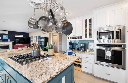 On cooler days, light the propane fire pit under the waterproofed deck or cozy up to the gas fireplace inside.