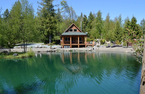 This luxury cabin is situated next to a gorgeous pond in a immaculate park-like country setting.This place is perfect for a romantic getaway or some much needed R&R. Beautiful custom- built cabin made from reclaimed barn wood and reclaimed lumber from the property, also comfortable hand made furniture crafted from reclaimed woods as well. This 2 bedroom 1 bathroom plus hide a bed in sofa will sleep 6 adults comfortably. Washer and Dryer are included as well as full kitchen with stainless appliances including a dishwasher. Flat screen TV with wifi in living room and DVD player. From nearly every room of the house you'll have views of your own private pond and waterfalls. The pond is full of koi fish, turtles, ducks and even stocked with trout. The 6 person hot tub is next to one of the two waterfalls on the property and just outside the downstairs bedroom for easy access. The large covered deck has a propane bbq for your use and some more great views. There's a big sandy beach area that comes furnished with chairs to relax in and a fire pit to cozy up next to in the evenings.
