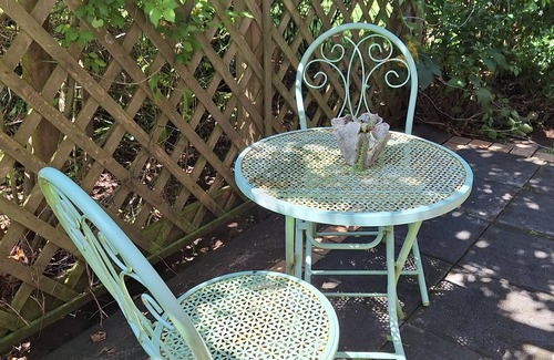 The guesthouse shares 1.5 acre of gardens with the main 1920's house (with a sunny patio/shared space in between). Both houses are in front of each other but still very private.