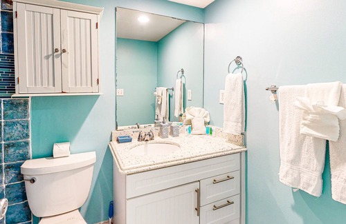 A restful night's sleep will come naturally in the nautical-themed bedroom. Shared washer/dryer access rounds out the condo's perks.