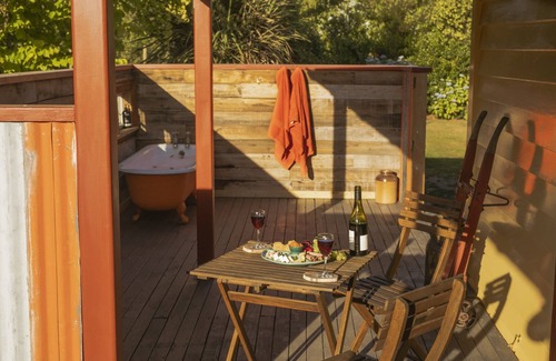 Quirky cottage completely renovated using as many recycled materials as possible with some special touches. Recycled materials were used from The Art Deco Mayfair threatre in Kaikoura. Also materials used from The Adelphi Hotel built in 1918. Kitchen custom made out of recycled cross arms off power polls and various other native timbers. Modern conveniences with stacks of retro and rustic charm. Enjoy a hot outdoor bath with a view to the mountains and two minutes walk to the beach. The odd train you will hear passing by.