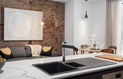 The apartment retains many original features including polished floorboards and brick-cladded walls, which add to the ambience of the apartment in a vibrant part of town. Kick back on the sofa or armchair in front of the smart TV, cook up meals in the gourmet kitchen and dine in style at the four-seater table. A balcony offers seating for two so you can soak up the area’s industrial vibe.