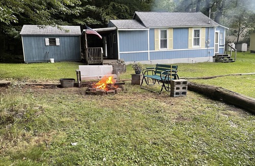 Nice cottage in private lake community. 3 minute walk to the beach. Covered front porch. With firepit and grilling area. One bedroom with queen size bed and full size futon in living room. Full bath and kitchen with all the necessary utensils, fridge, coffee pot, microwave, stove, plates, forks, knives, towels, linens supplied for your convenience. No smoking, please park in designated parking area.