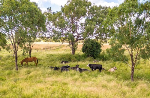 Enjoy a relaxing farm stay at The Rocky at Stones Throw Away in Stoneleigh, QLD. Perched on 40 acres by a peaceful creek, this hobby farm is home to friendly therapy animals including hand-reared calves, cows, a horse, chickens, and guinea fowls.