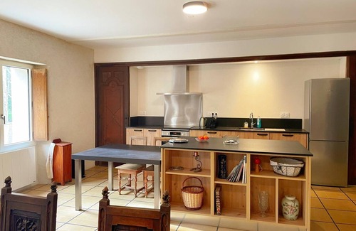The owner provides fishing equipment, as well as a recreation area with a net that can be used for volleyball or badminton matches. Inside, you'll discover a charming and spacious home that can accommodate up to 8 people. In winter, you'll curl up next to the fireplace (wood provided). The unusual turret gives you access to the upper floors and a superb view from the first-floor terrace. The 180m² accommodation (all inclusive except tourist tax) adjoins a hydroelectric mill.