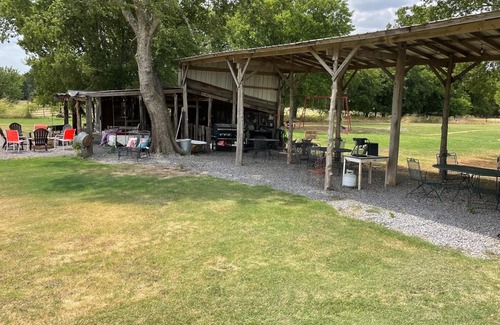 The name speaks a lot about the design of our cabin, from the old milker chandelier to the rustic furnishings it has to be called The Rustic Udder! The 2,400 sq ft. open layout has a loft with 1 Queen and 2 Twin beds, a queen size murphy bed, and a queen sleeper sofa in the game room. The bathroom is complete with a washer/dryer and a rustic shower. If cooking is your thing the kitchen has a full size range and refrigerator, and is stocked with coffee, sugar, salt, pepper and etc. Maybe you are more interested in having someone else do your cooking, not a problem! For an additional fee, a home cooked lunch/dinner can be provided. Breakfast items will be available in the cabin for you to pick from. There is an outdoor grill located in the she shed out back. In the shed you'll also find a swinging bed and plenty of other seating options. A seasonal stock pond pool is located by the she shed, to help cool and relax you. And if that's not enough to entice you to stay, the Rustic Udder is only 30 mins or less to some great locations such as, Choctaw Casino Resort, Lake Texoma, Rock House Vineyard, Blue River winery, Crystal Creek Winery, Harbinger brewery, Downtown Durant and McGee Creek State Park. So if your looking to relax or have some fun The Rustic Udder is the perfect place to stay!