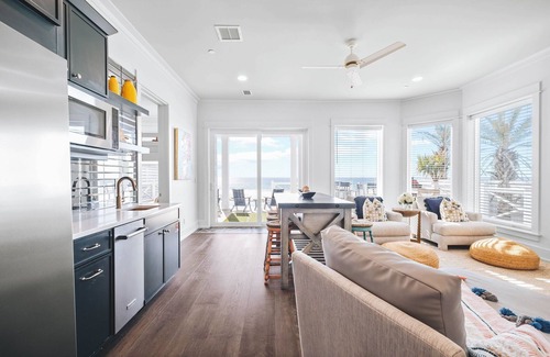 On the second floor, you'll find the main living area designed for comfort and connection. This open-concept space includes a living room with panoramic windows, a Smart TV above the electric fireplace, and professionally designed interiors. The adjoining kitchen and dining area are fully equipped and spacious, ideal for hosting gatherings. Step out onto the large balcony to enjoy breathtaking, unobstructed Gulf views.
