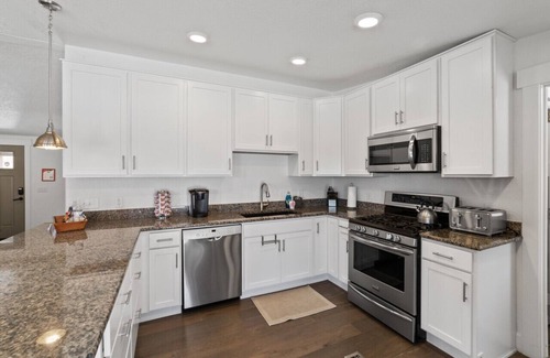 The inside of this home is full of natural light, all new furnishings, cable TV and wifi. It is professionally cleaned and well stocked with extra bath and kitchen supplies. It has plenty of extra clean cozy blankets, and pillows. 3 bedrooms and 2 baths. 1 King with ensuite shower, 2 Queens with a shared shower-bath, plus a sofa bed in the living room. Full kitchen with all appliances. Heating and air conditioning.