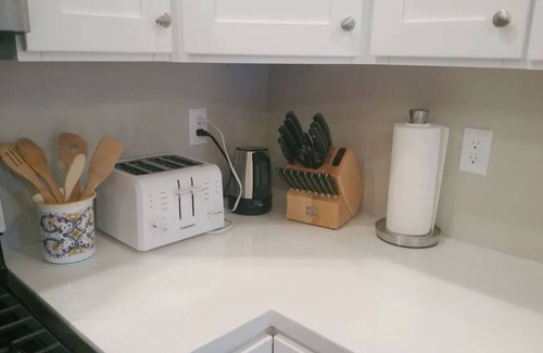 Both bedrooms boast brand new queen beds and en suite bathrooms. One room has a soaker tub and the other has a shower and 40" smart tv.