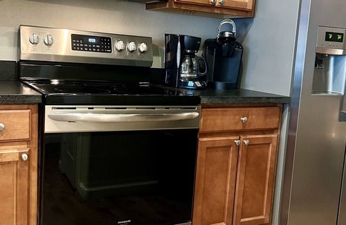 WI-Fi. The kitchen has granite counters, more modern stainless appliances, a new full-sized washer, and dryer, a Keurig coffee maker, and a Mr. Coffee machine. Newer wood laminate floors. The dining table seats four and the breakfast bar seats 3, with great views of courtyard walkways and meticulously maintained pool. The large covered balcony faces a shady South exposure with tree-top views of lush green landscape. We are an end unit, very private, and no one above you. Extra quiet!