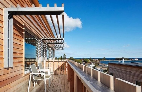 Welcome to the SkyHouse! This home was featured in Mn Monthly, Arch Magazine, Midwest Home, among others, and has won awards around the globe. Other than her sister properties the Horizon, and the smaller Aurora, there is nothing like this anywhere on Earth. These are unique, and are a limited design intended to inspire. Enjoy the unique beauty of Grand Marais and the harbor from the panoramic window views of this beautiful home. Designed by celebrated Minnesota architect David Salmela to capture all the needs and dreams of a visitor to Grand Marias. Come enjoy this cool cabin in America's "Coolest Small Town". By design, the Sky House provides for all the needs of a vacationing party of up to 6 people in a 1264 Sq. Ft. home but 4 people are ideal. We are a dog friendly stay with the payment of the appropriate fee and understanding of the rules. The Sky House provides an inspiring, modern space that allows for privacy among those sharing the lodging, and also provides a breathtaking great room area on the top floor with fantastic views of the Grand Marais harbor, the neighborhood, and the town. Everything is in short walking distance from our micro community right in the heart of Grand Marais. Every restaurant, bar, coffee shop, gallery, and Grand Marais' famous beach are all a very short stroll from this private residence. The home is designed in modern Nordic fashion. The design is contextual architecture that completes a timeline of Scandinavian and Nordic design that the owners began on the property next door that also honored northern buildings in the roots of their designs. There is off street parking under a sod roofed carport. There is also an electric car charging station in the car port. Walk up to the entry area and pass under the arch to the first of 3 decks where there is room to store bikes in summer, and once inside, there is plenty of room to shake off the snow, hang the coats and set down the skis or snowshoes. Each bedroom is very private is separated from the other by a soundproofed floor and ceiling for maximum privacy. Each bedroom also has its own restroom with shower, work station, free standing closet, queen bed, and balcony or patio with great views for getting away from the group. Continuing up the inspiring staircase leads you to the primary gathering area on the top floor. This area is breathtaking with its expansive windows, view of the town and harbor, Lake Superior and the grounds. It is simply the best view from a lodging in Grand Marais. There is a fully modern and capable kitchen, an architect designed built in sofa for single sleepers, and a contemporary gas fireplace. The sofa can sleep one adult or two children as is, or it can be modified to sleep one adult above and one adult on floor cushions. Note the unique skylight with natural light filtering treatments and the push button electronic pop up television that you can leave hidden if you wish. There is also a wrap around deck on this top level with fantastic view of the rooftops and harbor and the town and of course Lake Superior. There is a utility room with full size washer and dryer. Everything about the Sky House is designed with environmental sustainability in mind. These homes have an incredibly small footprint both structurally and environmentally. The foundations were designed to take up as little of the yard as possible- by being small at the start and increasing as you go up just like the old Stabur upon which this design is based. No cost has been spared to make the Sky House the highest quality, most significant architectural addition to Grand Marais' beautiful landscape. We hope you will find it warm, welcoming, and a once in a lifetime experience in one of the world's most magical places. Sauna is available on a first come first served basis and is private- message owner to verify availability prior to completing your reservation.