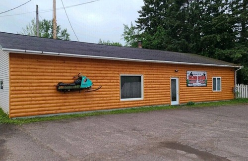 The Sled Stop located right on snow/atv trail in Bruce Crossing. Parking lot out front. We have newly remodeled and carpeted interior with 3 bedrooms(4 total beds) futon and extra full size fold down bed 6 separate beds for people easily sleeps 8 people. 1 bathroom with stand up shower, very large great room with bar and big sectional couch, large tv with Netflix and high speed wifi. Plenty of space for gear and people. Bowling alley with bar and grill right next door, Cafe behind building, gas station(sells trail passes), grocery store, hardware/auto parts store, laundromat all less than a block away. Everything you need in 2 blocks!