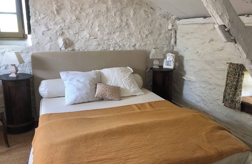 In the old stone barn adjoining the house but with its own entrance (former sheepfold), we offer a small gîte for two, consisting of a bedroom under the roof (very comfortable 160 bed) and on the ground floor a dining area overlooking the garden with simple but complete kitchen in its bar (the dishes will be done by hand), private bathroom with large bathtub and separate toilet.