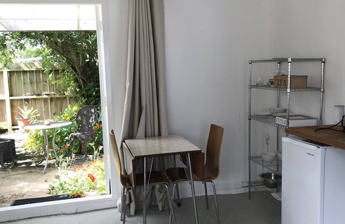 'The Smithy," once a blacksmith shop is behind a private home. It is a bit quirky but flooded with sunlight. A heat pump is on the wall to keep you warm in the winter and cool in the summer months. French doors lead to a private shady courtyard where guests can relax after riding or walking the Hauraki Rail Trails which begin 200 metres down the road.