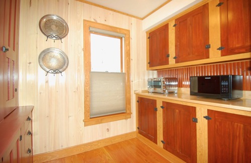 This 1917 farmhouse has been painstakingly restored as a vacation rental house and affords all the conveniences of home. Chamberlain Brook runs through the property and flows into a small waterfall near the edge of the property.