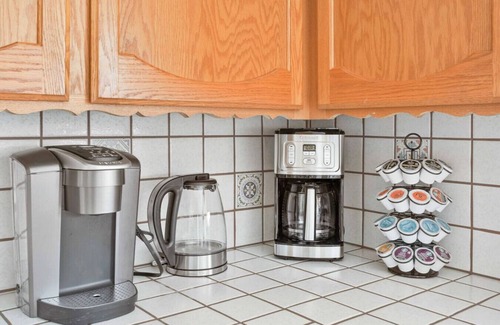 A fully stocked kitchen with modern appliances, bakeware, coffee options, and kid-friendly dishware.