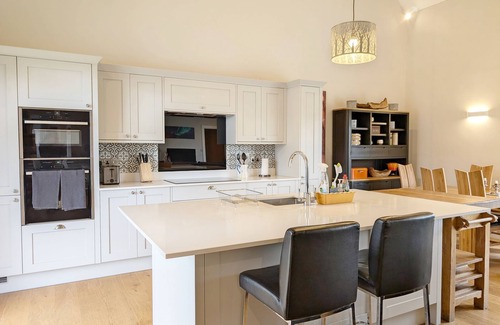 Upon entering, you're welcomed by an open-plan living and dining area, featuring reclining seats, a log fire, a Smart TV, and a collection of books— everything you need for a relaxing night in after a day of exploring the local area. For some extra fun, why not gather around for a family games night with the many board games provided by the hosts? The newly refurbished kitchen is fully equipped with a double oven, electric hob, large fridge/freezer, kettle, toaster, and more, ideal for preparing delicious family meals. There's even a second fridge/freezer in the utility room to ensure you have plenty of storage for all your holiday treats.