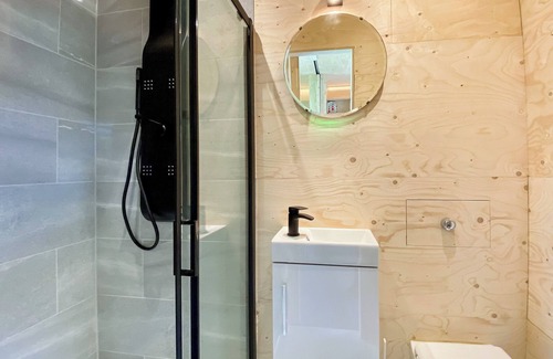 Shower Room: Cubicle Shower, Heated Towel Rail, Toilet. Electric central heating, electricity, bed linen and towels included. Welcome pack. Front garden with sitting-out area, garden furniture and barbecue. Private parking for 1 car. No smoking. . The Studio offers a unique and inviting experience for a couple, boasting an open-plan layout that maximises space and comfort. As you step inside, you’ll be greeted by a tastefully furnished living area, complete with a cosy Murphy bed which neatly folds away, providing ample room to relax during the day. There is also small kitchenette for your convenience during your stay. While not fully equipped like a traditional kitchen, it has all the essentials you need to prepare quick and light meals. Enjoy your favourite shows on the Smart TV or sit down for a meal at the dining table conveniently set nearby. One of the highlights of The Studio is the exquisite infinity bath positioned in the heart of the living space. You can indulge in a luxurious soak while gazing out through the large windows that frame the breathtaking rolling countryside views. It’s an opportunity to unwind and reconnect with nature in complete tranquillity. Adjacent to the living area is a separate bathroom where you can freshen up with a refreshing shower.