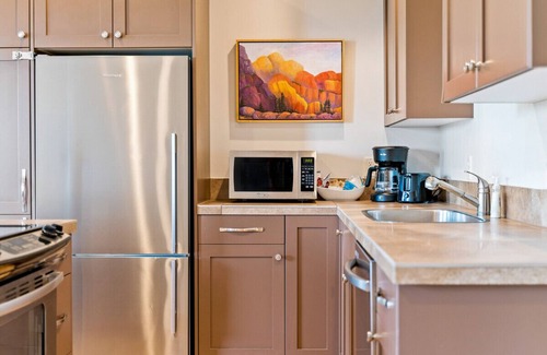 One bedroom suite with full kitchen. One King bed, private bathroom with tub/shower and closet. Furnished living room with flat screen TV, 55 in smart TV in bedroom area as well. Dining area for two. Front and back balconies facing North and South with chairs and table. No pets allowed. Additional one bedroom & one bathroom available for additional cost. Discount for weekly stays, no monthly stays allowed in this unit.