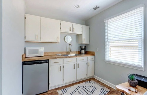 The Tea Olive Cottage on Taylor is a quaint cottage with one bedroom, kitchenette, and sleeper sofa. Just off a shared courtyard with two other units, the cottage has a private entrance from the alleyway. The cottage features a smart TV, comfortable furniture, and a single bedroom with a queen mattress wrapped in crisp, comfortable linens. A closet and dresser provide ample storage for extended stays.